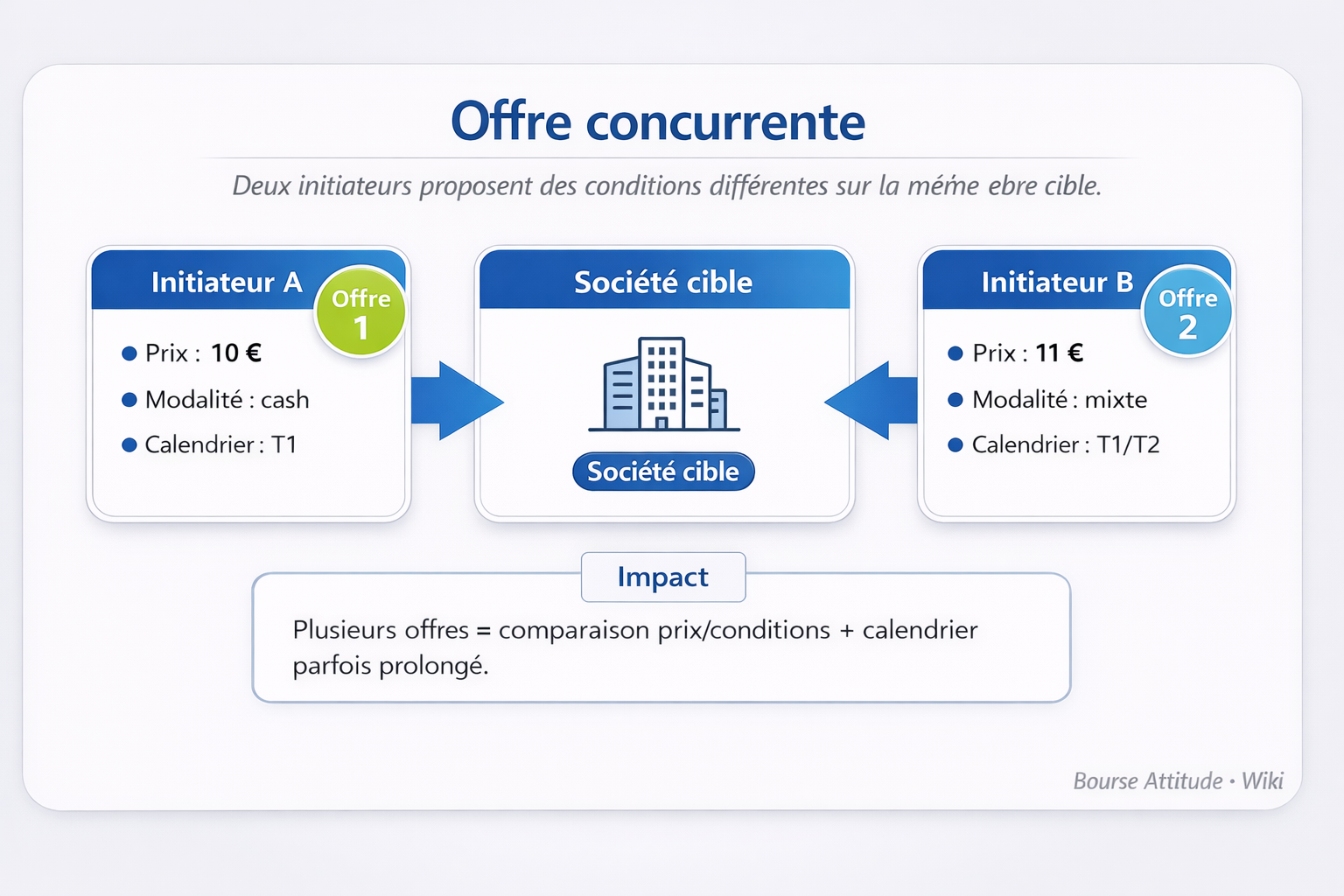 Une offre concurrente apparaît lorsqu’un autre initiateur (un concurrent, un fonds, un industriel…) propose une offre sur la même société, pendant que l’offre initiale est en cours ou juste après son lancement.