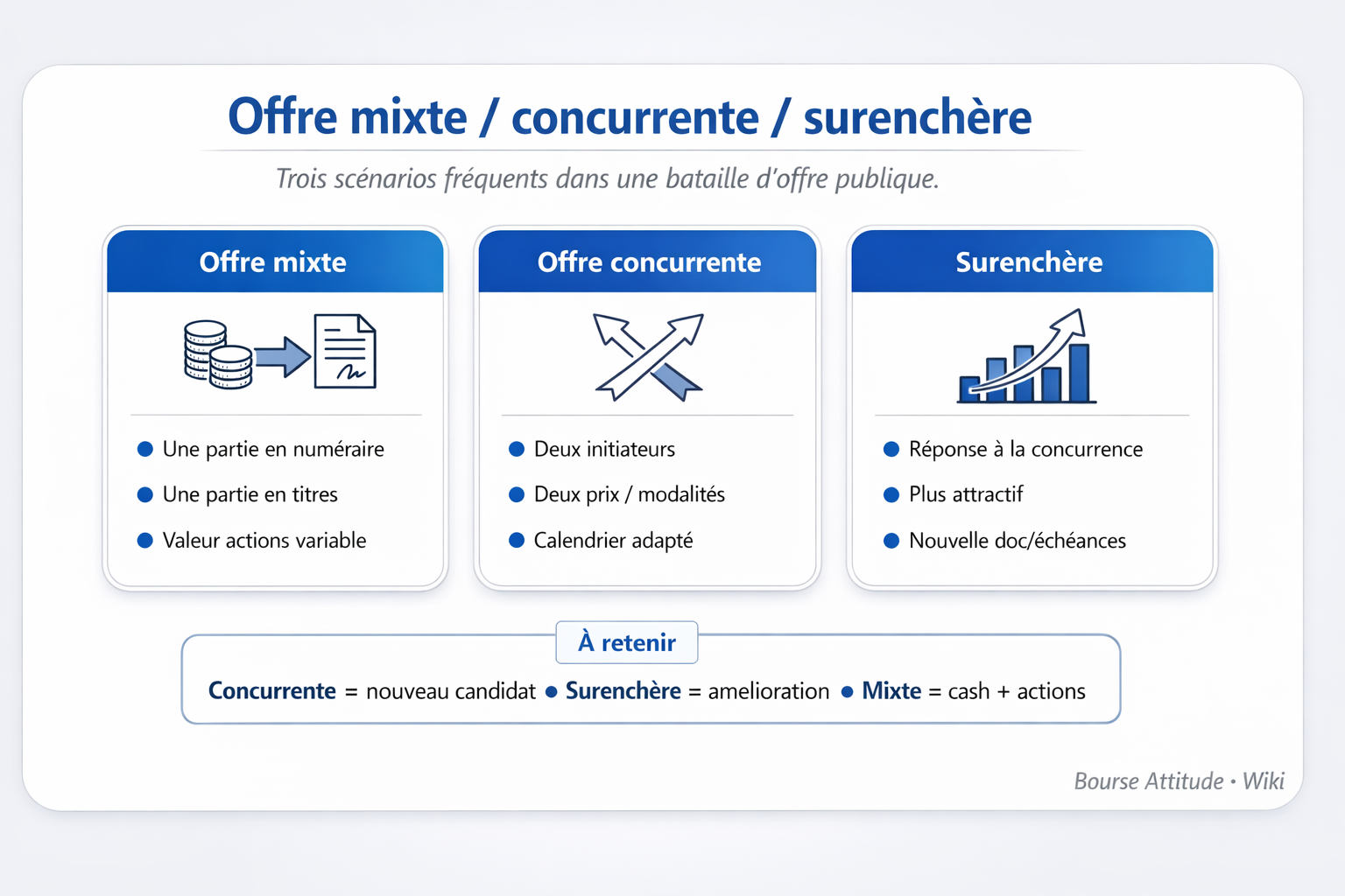Dans le cadre des offres publiques (OPA, OPE, OPM…), il peut arriver qu’une opération “simple” devienne plus complexe : un autre acteur peut proposer une offre concurrente, l’initiateur peut réagir via une surenchère, ou l’offre peut être structurée comme une offre mixte (cash + actions).