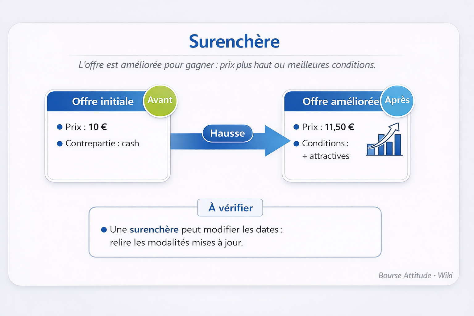 Point d’attention : une surenchère implique souvent un nouveau calendrier ou une mise à jour de la documentation. L’actionnaire doit vérifier les nouvelles modalités.